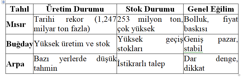 ****Sonuç olarak 2025-2027 yılları arası tahıl için en bol yıllardan biridir. Dünya rekor kırıyor ama bu bolluk herkese yetmeyebilir. Büyük ithalatçılar (Çin, Mısır, Türkiye) ucuz mal peşinde koşarken, bizim gibi üretici ülkelerde fiyat düşük kalıyor.