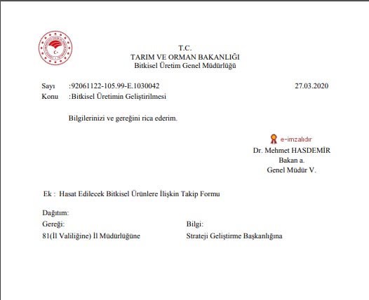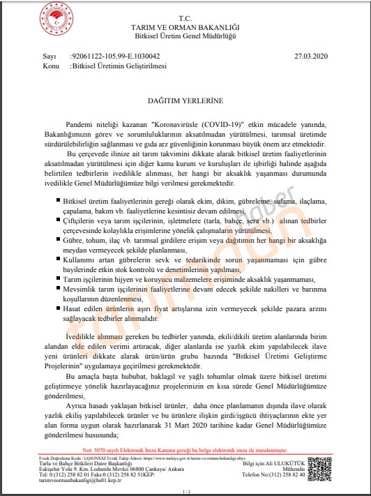 Tarım ve Orman Bakanı Bekir Pakdemirli adına Bitkisel Üretim Genel Müdürü Mehmet Hasdemir imzasıyla 27 Mart’ta 81 İl Müdürlüğüne bir talimat gönderildi. Talimatta pandemi niteliği kazanan koronavirüsle etkin mücadelenin yanında, Bakanlığın görev ve sorumluluklarının aksatılmadan yürütülmesi, tarımsal üretimde sürdürülebilirliğin sağlanması ve gıda arz güvenliğinin korunmasının önemine işaret edildi.