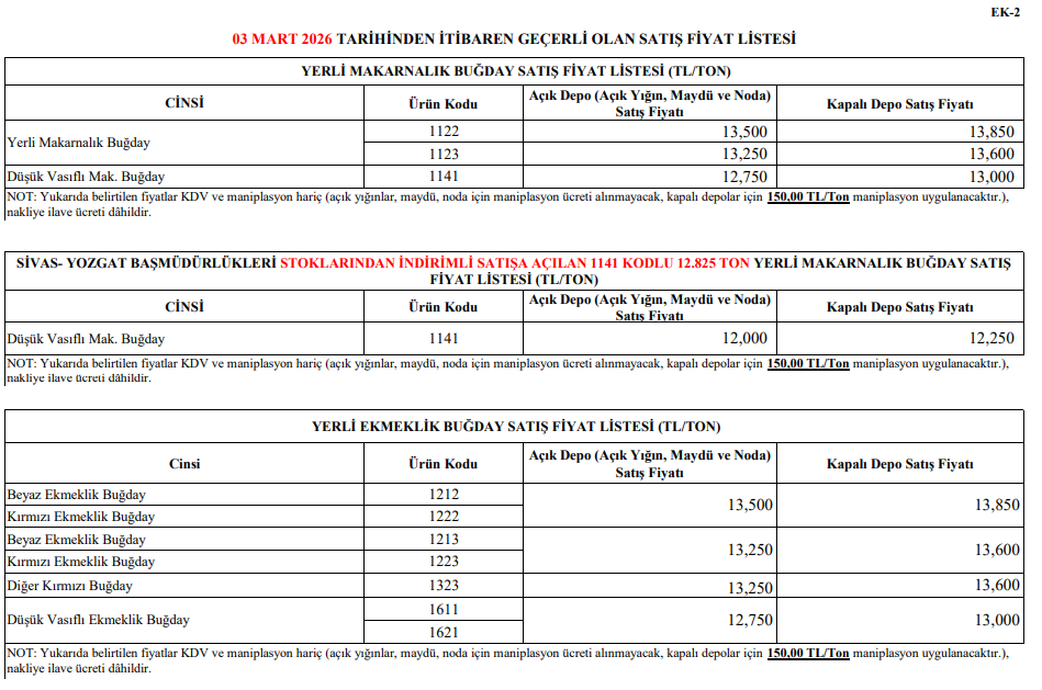 TMO, Mart ayında satışını gerçekleştireceği, buğday ve arpa satış fiyatlarında bir değişikliğe gitmedi. Yerli makarnalık buğdayın tonu 13.500 TL'den, ekmeklik buğdayın tonu 13.500 TL'den ve arpanın satış fiyatı da 11.300 TL olarak belirlendi.
