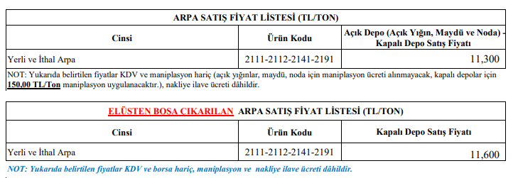 Arpa satışlarının ise yalnızca fiili tüketim esasına göre; büyükbaş ve küçükbaş besicilere, yetiştiricilere, yem fabrikalarına yapılacağı bildirildi. Kanatlı hayvan yetiştiricileri, kırıcı, ezmeci ve flakecilere arpa satışı yapılmayacağı da duyuruda özellikle vurgulandı.
